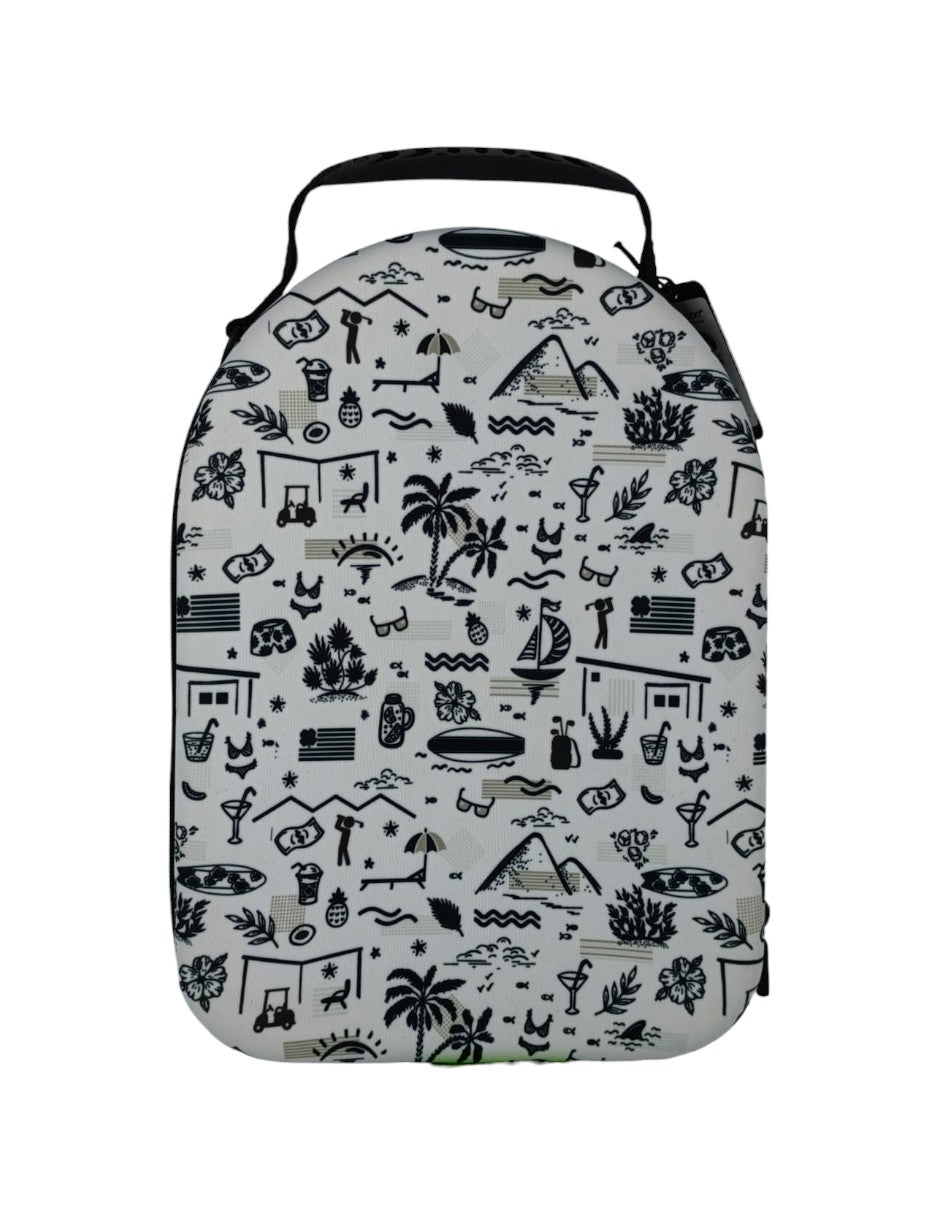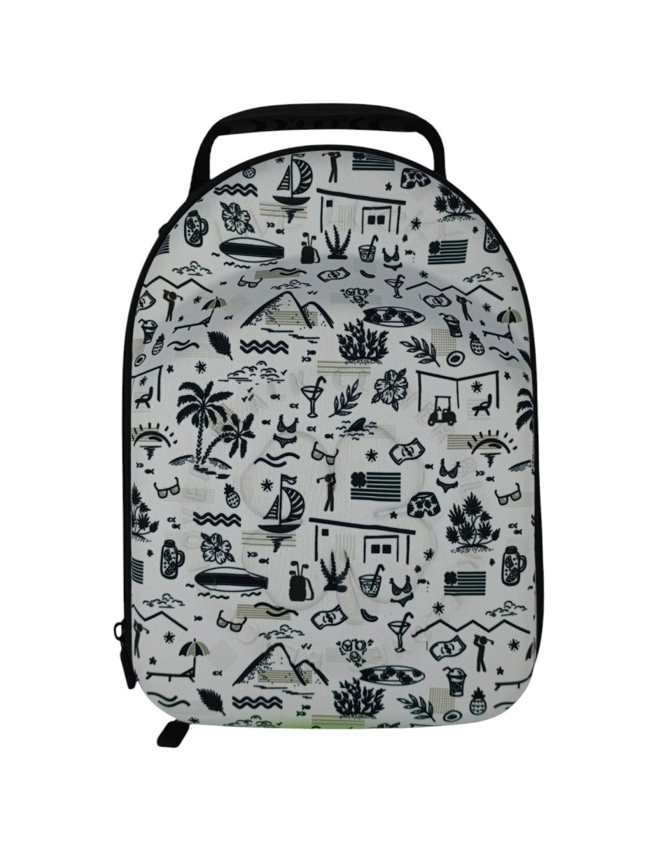 Guarda tus sombreros Black Clover favoritos con estilo con nuestro exclusivo carrito para sombreros blanco con íconos negros que recuerdan a unas vacaciones. ¡Con cremalleras de doble dirección, este carrito cuenta con una tela que absorbe los golpes y puede proteger y almacenar hasta 6 sombreros! Las características adicionales incluyen salidas de aire y un estuche interno para gafas de sol. Este carrito es la manera perfecta de guardar sus sombreros en su armario, en su vehículo o durante las vacaciones.