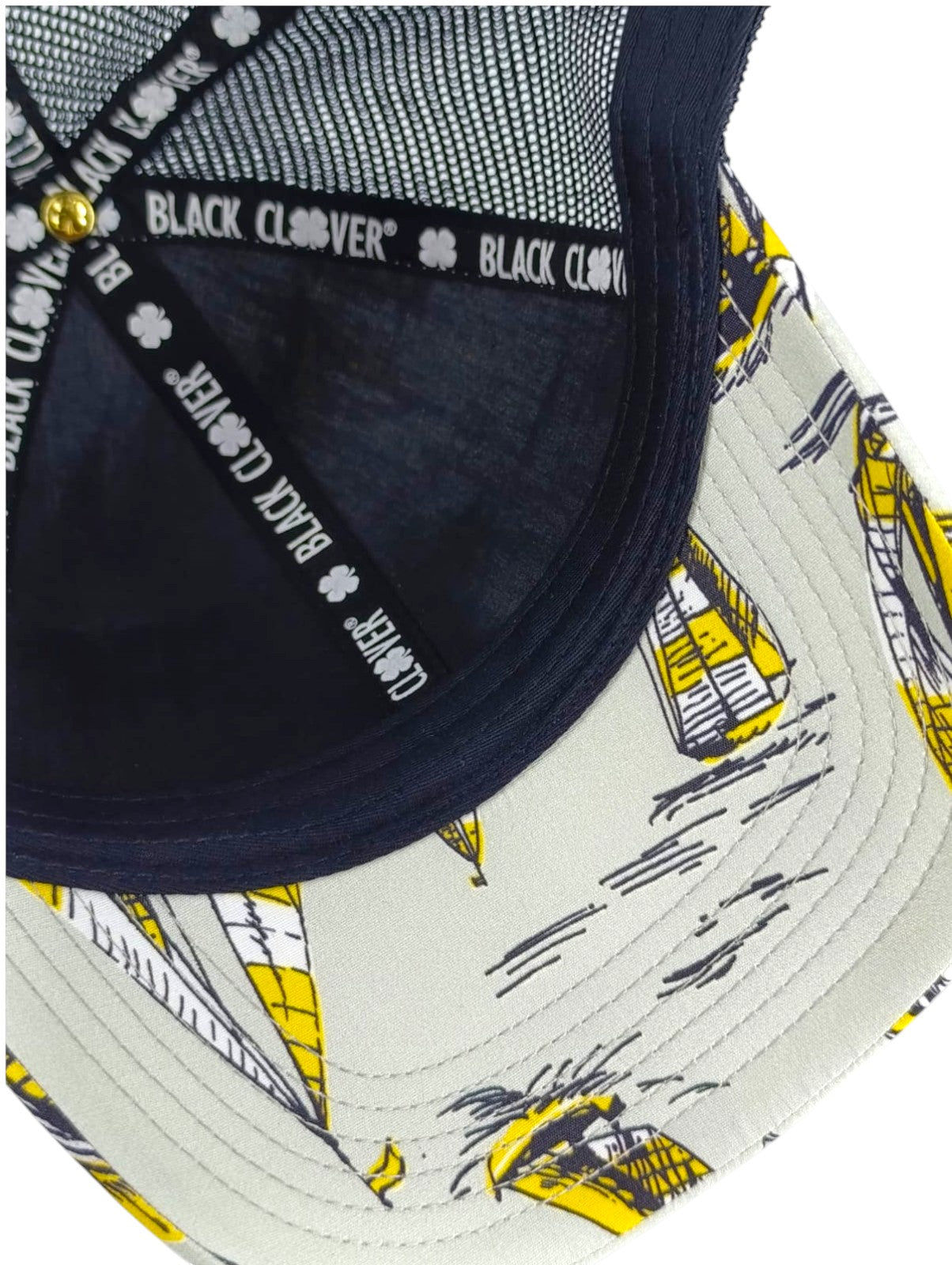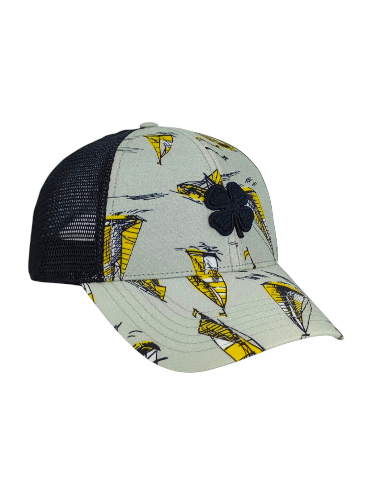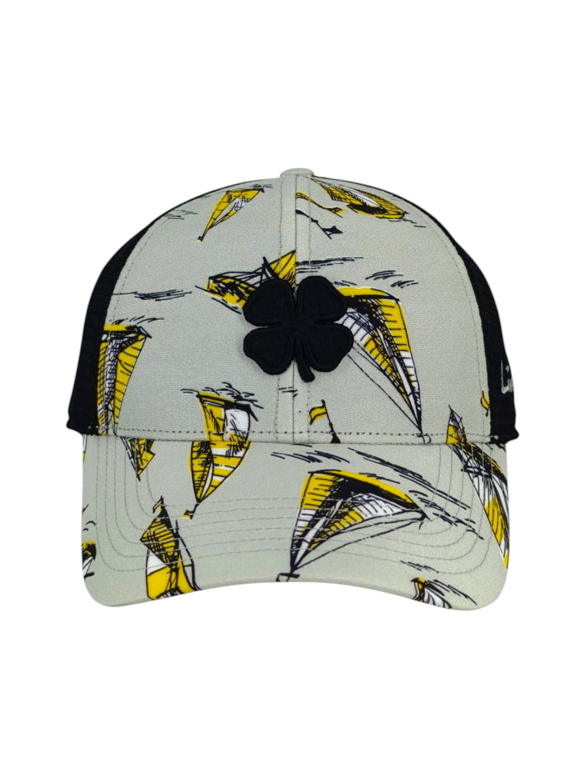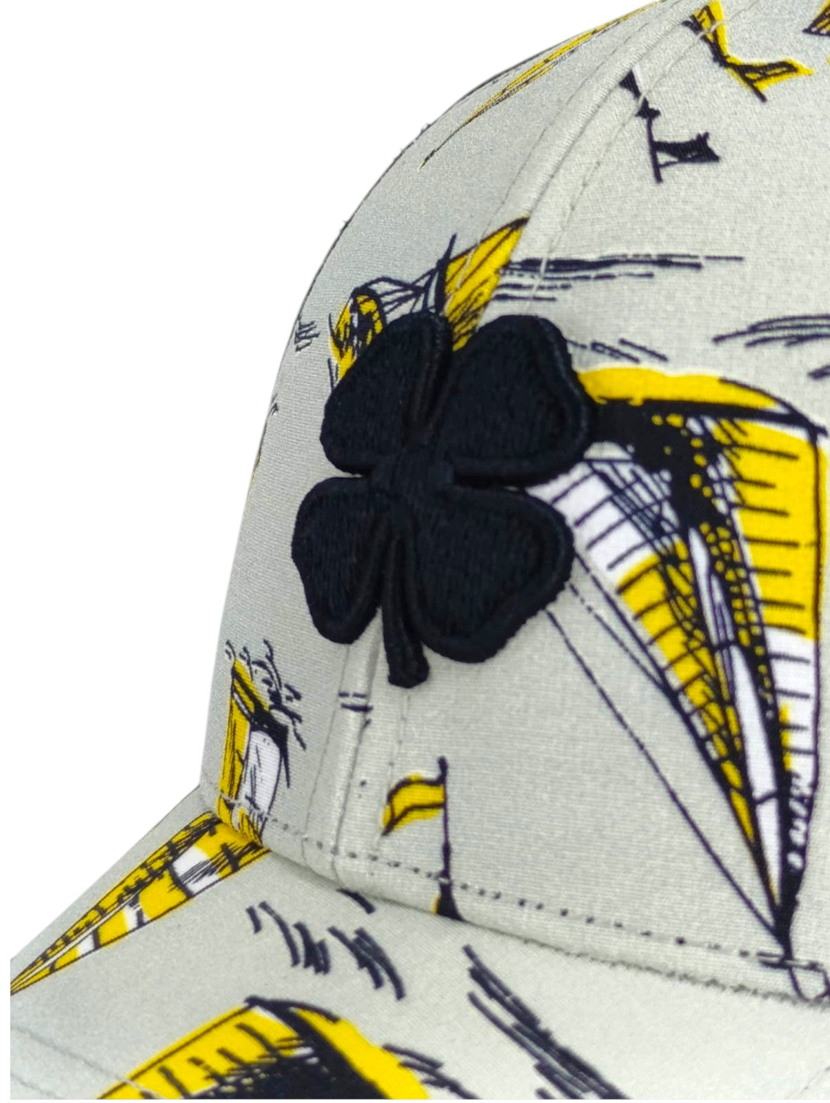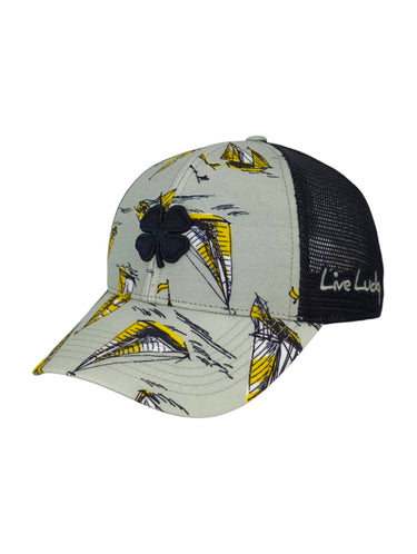 Disfruta de unas minivacaciones con nuestra gorra Island Luck 28, un elegante accesorio playero para los días de calor. Confeccionada con un estampado tropical en gris, amarillo y blanco con malla negra, luce un trébol negro en 3D. La parte trasera ajustable garantiza un ajuste perfecto, y cada gorra es única y versátil, ideal para el verano.