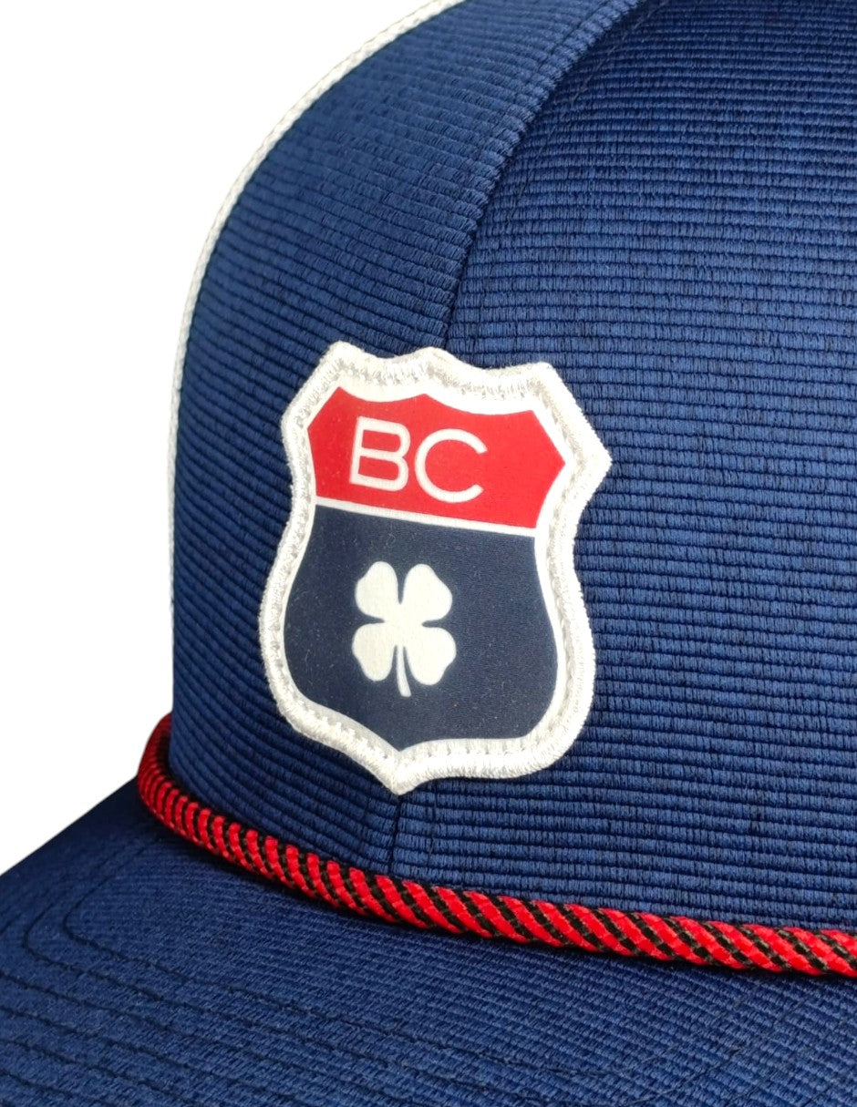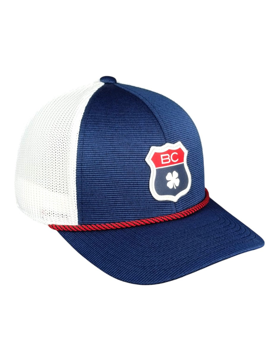 La parte frontal luce un parche con temática de carretera en rojo y azul con nuestro trébol característico, y la parte trasera ajustable garantiza un ajuste perfecto en todo momento. Esta elegante gorra patriótica es el complemento perfecto para cualquier atuendo casual, y la cuerda bicolor, blanco y azul marino le da un toque extra de estilo.