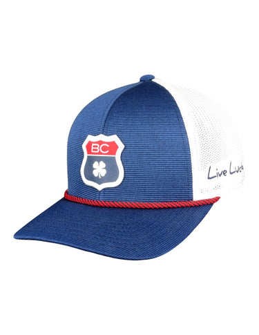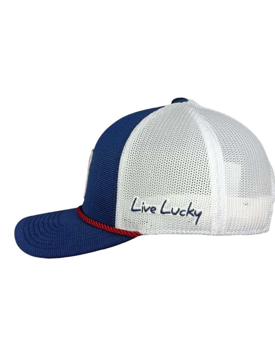 Demuestra tu orgullo estadounidense con nuestra gorra Lucky Route. Diseñada en azul marino, esta versátil gorra cuenta con malla blanca para un ajuste fresco y transpirable.