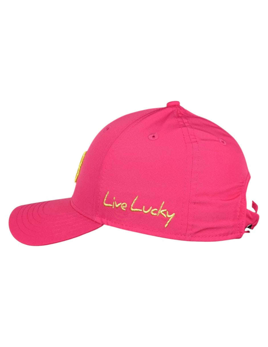 - Gorra color fucsia con icono dorado metálico en 3D